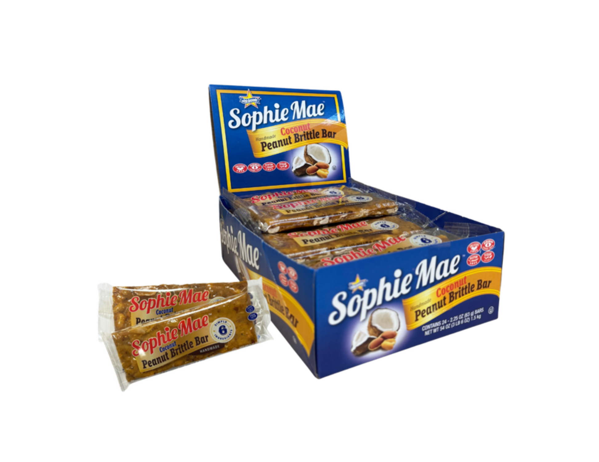 Sophie Mae® Coconut Peanut Brittle is a twist on our classic peanut brittle with coconut for added flavor and fun. Each bar is 2.25 ounces, with 24 bars in a display box.